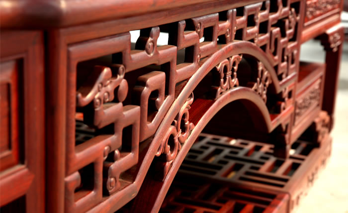 流程三雕刻工序 為了讓紅木家具看上去更美觀(guān),在木工工序完成之后一般都會(huì)用一些或簡(jiǎn)單或復(fù)雜的雕花來(lái)進(jìn)行裝飾,也就是行業(yè)中所說(shuō)的雕刻紋飾。雕刻紋飾必須在“認(rèn)榫”完成后進(jìn)行,因?yàn)椤罢J(rèn)榫”時(shí)需要修整,如果先做好雕花再開(kāi)榫,紋理很難保證雕花部件都在同一平面上,而此時(shí)為了保證雕花...